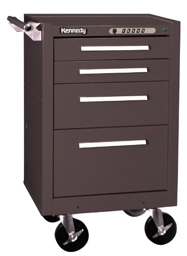 Kennedy 4-Drawer Roller Cabinet (21042) Ball-bearing drawer slides on all drawers. Comes with 5 x 1-1/4 in. casters, tubular end handle Electronic push button lock will hold five access codes Uses four AA batteries and has low battery warning Available in Brown (21042B) Black (21042BK) Red (21042RD)