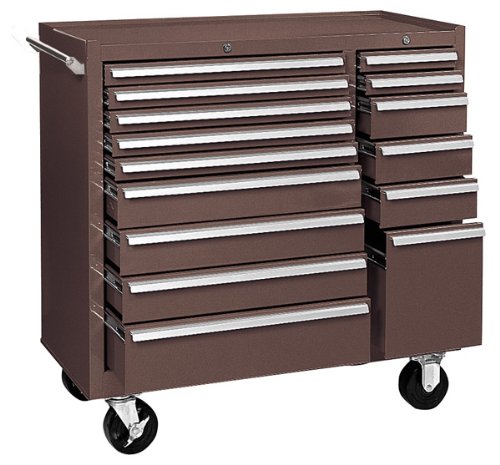 Kennedy 15 Drawer Heavy Duty Maintenence Cart (315X) Heavy gauge steel for high durability. Huge 39 in. x 18 in. work surface. Comes with ball-bearing drawer slides. Includes tubular side handle, full-width drawer pulls Two keyed alike tubular locks 5 x 2 in. sintered bearing casters. Available in Brown (315XB) Black (315XBK) Red (315XR)