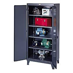 Super-strong, all-welded storage cabinets handle your most demanding storage requirements. STRONG HOLD Ultra-Capacity Lifetime Cabinets are quite simply the strongest cabinets available today! Doors swing open a full 180°. Adjustable shelves on 2" centers. 1000–1900-lb. capacity per shelf. 12-gauge cabinet; 14-gauge shelves. Padlock handle with three-point lock. Available in steel or corrosion-resistant stainless steel. NOTE: Overall height includes 6" high all-welded legs. 4180423, 4180428 have one door.